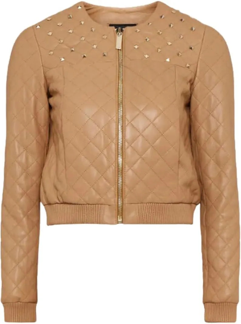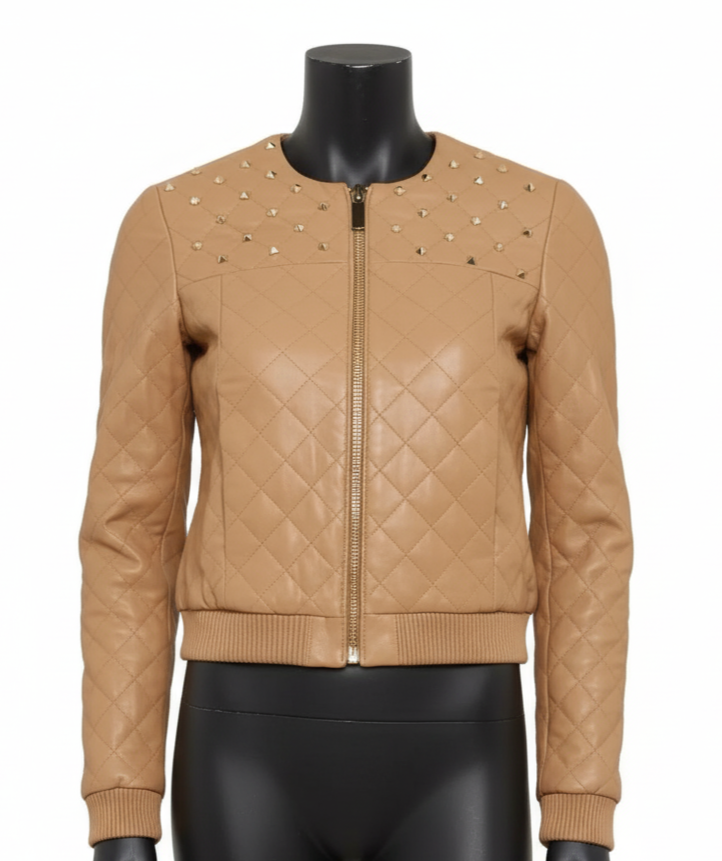 Beige Quilted Lambskin Leather Biker Jacket – Studded Bomber Coat