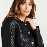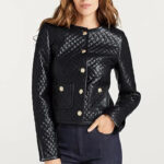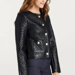 Crafted from soft, supple lambskin, it offers lightweight warmth with a perfect modern fit. The jacket features a distinctive studded neckline and a sleek gold zipper, setting it apart from ordinary outerwear.