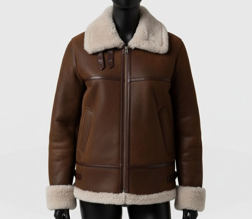 🧥 Crafted from premium Brown sheepskin leather , this aviator coat features real shearling lining for unbeatable comfort.
