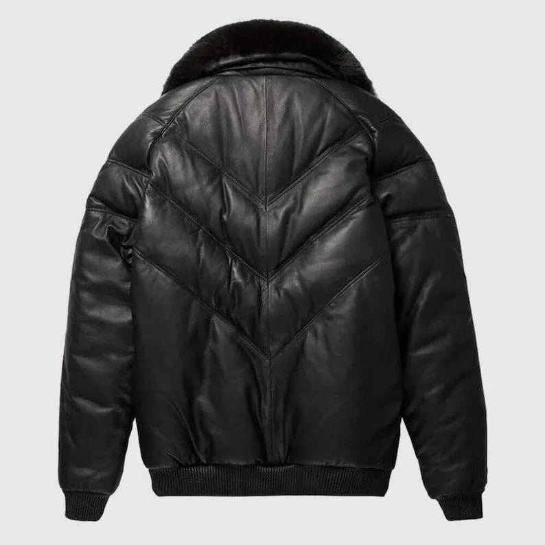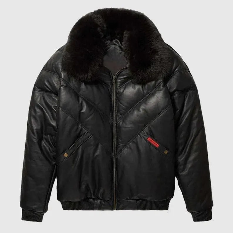Men’s V-Bomber Leather Zipper Jacket Puffer Fox Fur Collar Blue Lambskin Coat