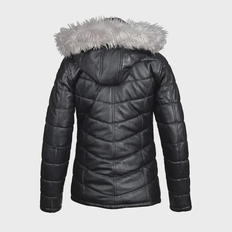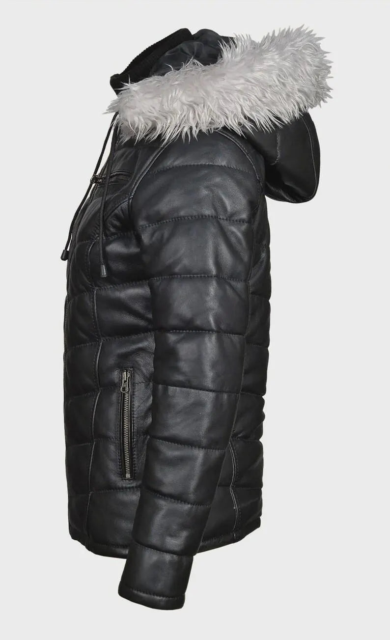 Women’s Black Lambskin Quilted Puffer hooded Jacket | Real Leather Cropped Puffer Coat